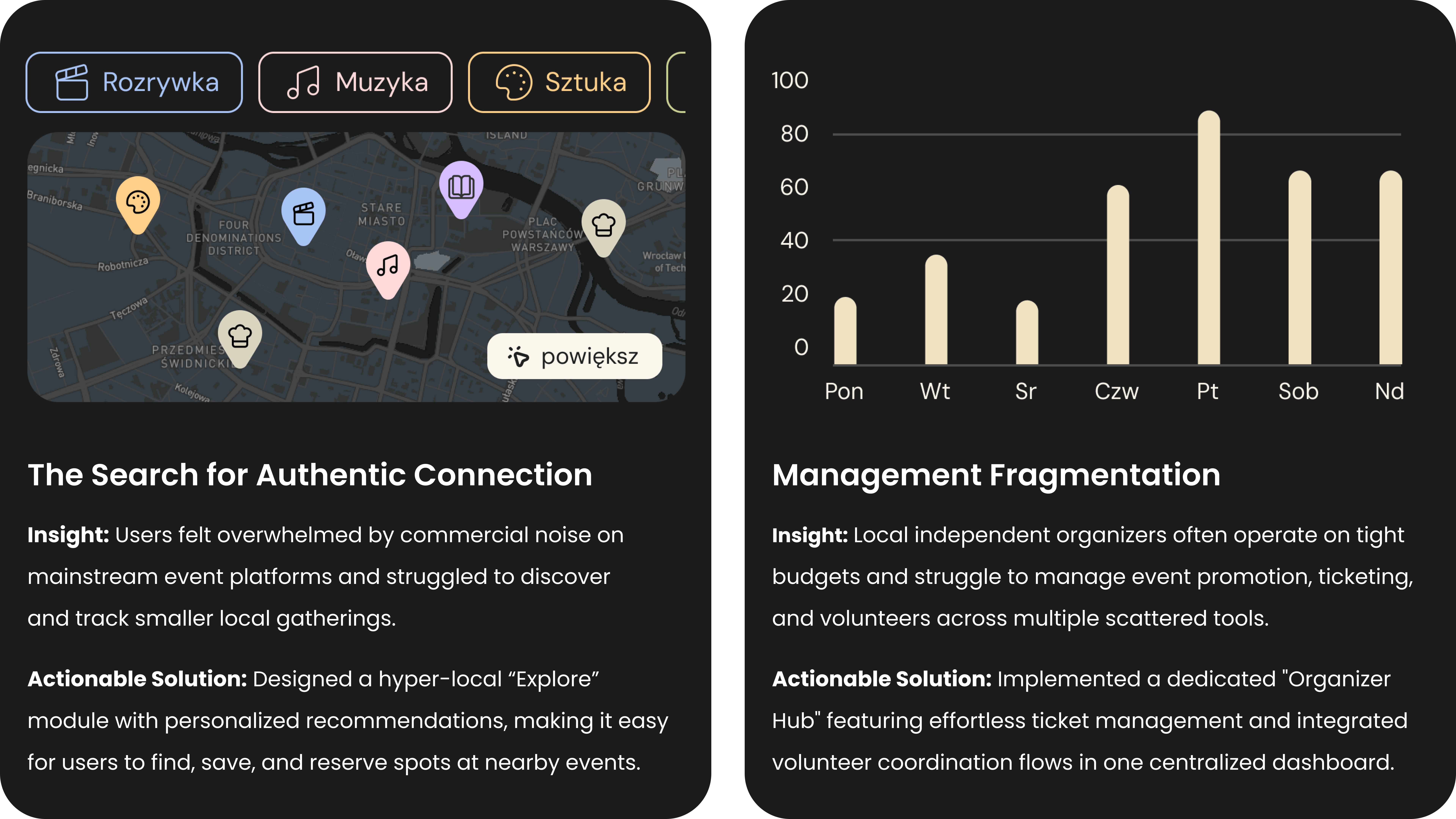 In modern cities, people often experience "mind decay" and isolation, struggling to find authentic, grassroots initiatives amidst a sea of massive, commercial events. Simultaneously, local organizers lack accessible, centralized tools to promote their events, manage tickets, and coordinate volunteers. The primary goal of this project was to design an intuitive platform that balances the distinct needs of community seekers and local event creators, removing friction from both discovery and management.